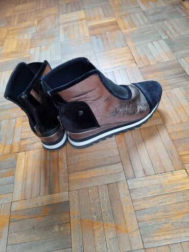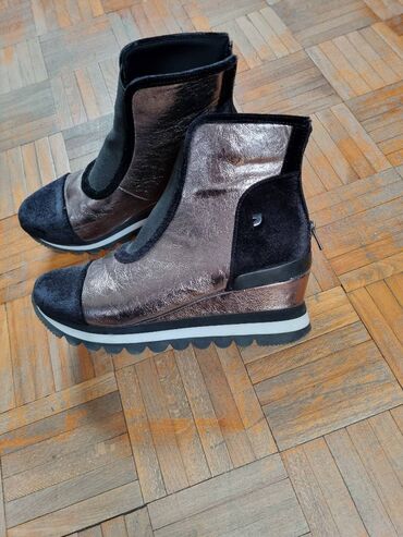 - Boja/materijali: kombinacija bakarno-metalik kože/sintetike sa crnim pliš/suede detaljima i elastičnim crnim umetkom sa prednje strane