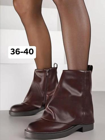 - Model 1: Glatke bordo/braon gležnjače sa bočnim rajsferšlusom i preklopljenim gornjištem. Okrugao vrh, niska blok peta i gumeni đon sa finim štepovima. Minimalistički izgled koji se lako kombinuje uz suknje, haljine i uske pantalone. Dostupne veličine: 36–40 (naznačeno na fotografiji).