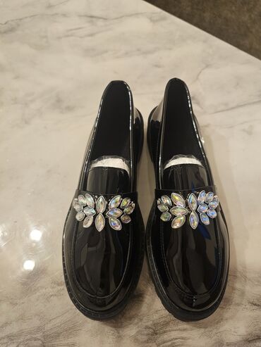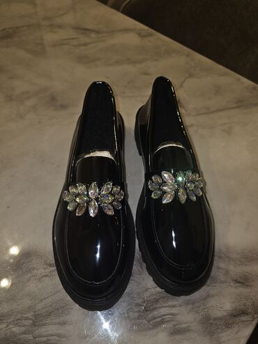 Prelazno vremeCrne ženske loafer cipele, lakovane, sa dekorativnom kopčom ukrašenom iridescentnim kristalima u obliku listića.