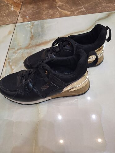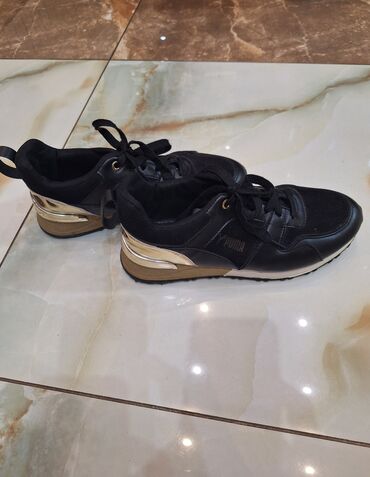 - Crna osnova sa zlatnim detaljima: metalik zlatna peta/klip, zlatni ringovi za pertle i bočni Puma logo