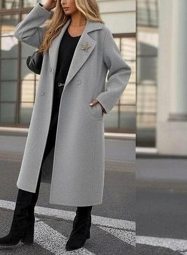 Elegantni ženski kaput – duži kroj sa rever kragnom i diskretnim ukrasnim brošem u obliku zvezde/morske zvezde.