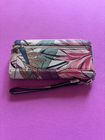ŠarenoŽenski novčanik marke Guess sa cvetnim dezenom. Novčanik je opremljen metalnim logotipom "GUESS" na prednjoj strani i ima rajsferšlus zatvaranje. Unutrašnjost nudi više pregrada za kartice i papirni novac, kao i poseban džep sa rajsferšlusom za kovanice. Uz novčanik dolazi i odvojiva ručka za nošenje oko zgloba, što ga čini praktičnim za svakodnevnu upotrebu ili izlaske. Cvetni dezen uključuje motive listova i cvetova u kombinaciji roze, plave, zelene i ljubičaste boje.