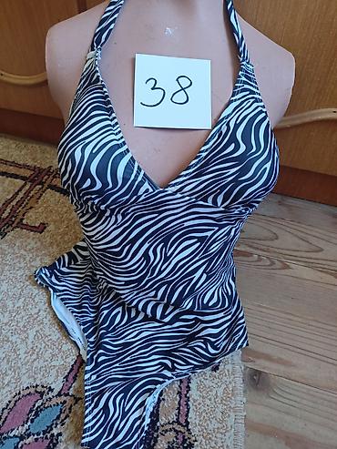 - Model 1: crno‑beli zebrasti print, vezanje oko vrata, duboki V izrez sa formiranim korpama. Dostupan u veličinama 36 i 38 (naznačeno na fotografijama).