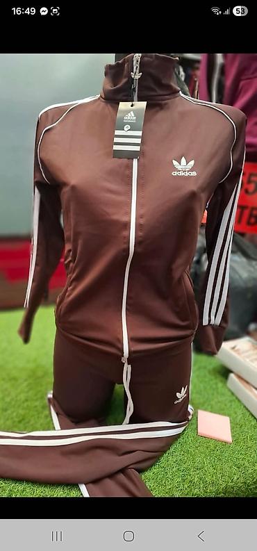 - Braon Adidas trenerka: jakna na rajsferšlus, visoki okovratnik, bele ivice i tri pruge po rukavima; donji deo sa učkurom; Adidas obeležja na grudima i butini.