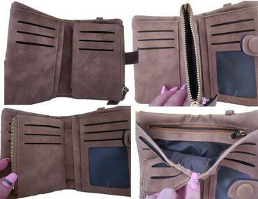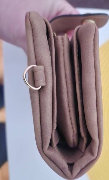 Ženski novčanik – svetloružičasta boja, teksturirana eko-koža sa zrnastim uzorkom. Elegantni detalji: zlatna metalna pločica napred i niz okruglih metalnih nitni sa spoljne strane. Organizacija un...