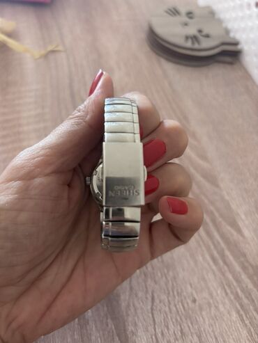 Uniseks ručni sat sa kvarcnim mehanizmom. Srebrne je boje, sa okruglim kućištem koje je ukrašeno detaljima nalik na cirkone oko brojčanika. Brojčanik je svetle boje, sa jasno označenim brojevima 12...