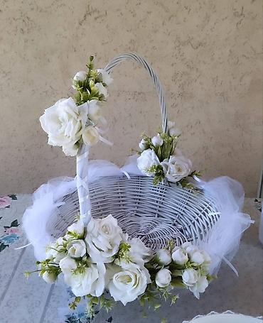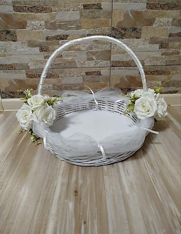 Napomena: Više varijanti dekoracije dostupno na fotografijama; izbor stila po preferenciji. Dimenzije približno srednje do veće korpe sa niskim rubom i visokom ručkom.