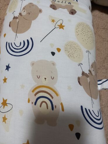 - Navlaka: pamučna tkanina bele osnove sa nežnim dezenom medvedića, zvezdica, balona i duge u bež, oker i tamnoplavim tonovima.