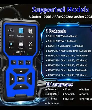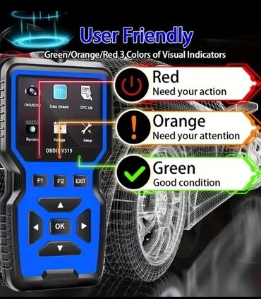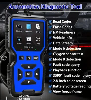 Ergonomski dizajn sa fizičkim tasterima (F1, F2, EXIT, strelice, OK). Ugrađen kabl sa OBDII konektorom. Idealan alat za brzo otkrivanje i praćenje kvarova, analizu podataka u realnom vremenu i proveru spremnosti sistema emisije.