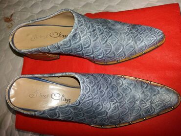 Moderne papuce u plavoj boji. Stabilna drvena stikla, sa potpuno novim flekicama.