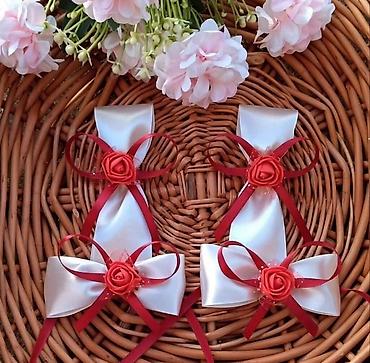 - Elegantne mašne od satenskih traka, ukrašene ručno rađenim ružicama i tankim ukrasnim vezicama.
