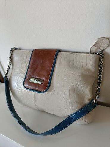 Detalji dizajna poput kontrastnih boja (bež, braon i plava) i lanca daju torbi moderni izgled, dok organizovani unutrašnji raspored omogućava praktično odlaganje osnovnih stvari.