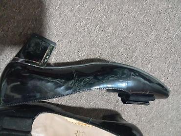 - Model: zatvorena cipela sa kvadratno zaobljenim vrhom i dekorativnom mašnom/ukrasnom pločicom napred
