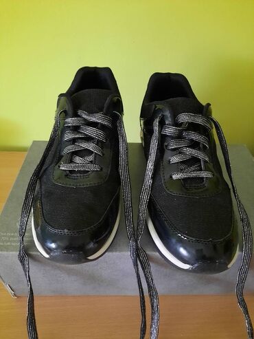 Materijal: kombinacija crne lakovane eko koze i svetlucavog platna sa sljokicama.
