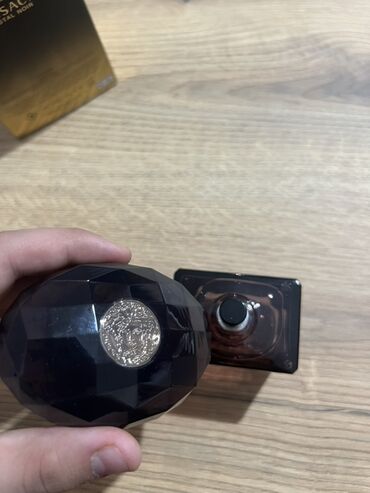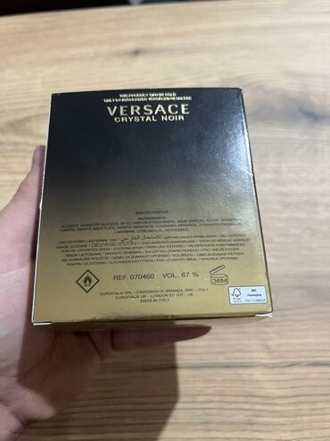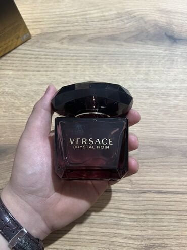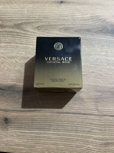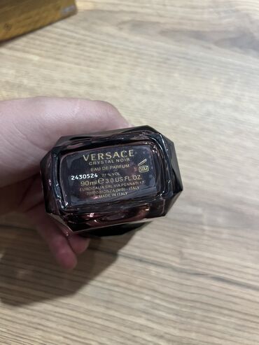 - Ambalaža: luksuzna zlatno‑crna kutija sa reljefnim uzorkom; tamni, facetirani čep u obliku kristala i tamna staklena bočica sa zlatnim logotipom “Versace Crystal Noir”.