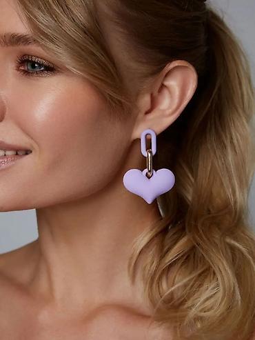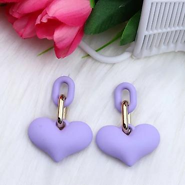 Akrilne minđuše u obliku srca lila boje sa zlatnim detaljima.