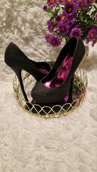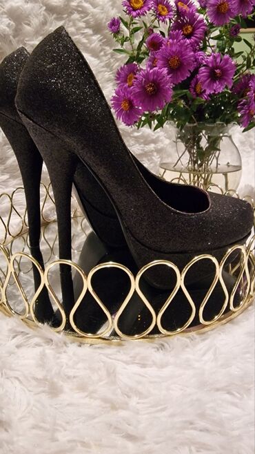 Damé cipele – broj 39 - Model 1: crne salonke sa visokom štiklom i tankom platformom. Klasičan zatvoren model bademastog vrha, glatka koža/eko-koža, crveni đon. Elegantne i pogodne za svečane pri...