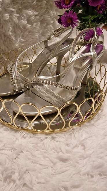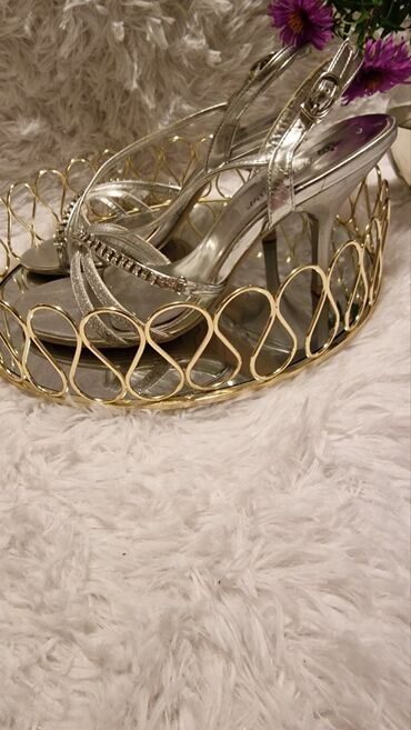 Zlatne sandale na štiklu veličina 42 nošene jednom - Elegantne sandale u metalik zlatnoj boji - Geometrijska štikla srednje visine sa otvorenim prostorom u sredini za moderan izgled - Kvadratni vr...