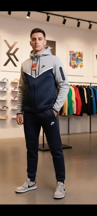 - Model 2: Tech Fleece stil sa kapuljačom i rajsferšlusom; kontrastne V pruge preko grudi; bočni džepovi i dodatni džep sa rajsferšlusom na rukavu. Donji deo sa štepovima na kolenima i elastičnim rubovima. Varijante boja: crno–plava, tamno plava, tamno plava sa svetlosivim gornjim delom.
