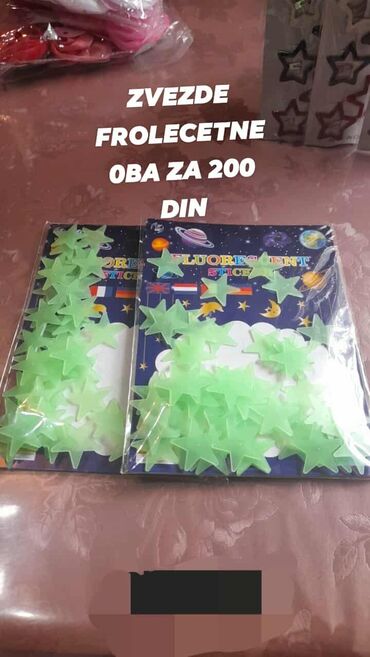 - Fluorescentne zvezdice za lepljenje na zid/plafon, dva pakovanja. Cena: oba za 200 din (naznačeno na slici).