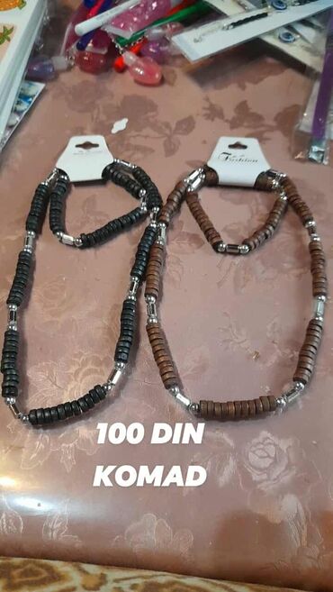 - Ogrlice i narukvice od perli (drveni i metalni segmenti), u crnoj i braon varijanti. Cena: 100 din komad (naznačeno na slici).