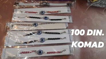 - Narukvice sa motivom “nazar” (plavo oko), različite boje kaišića/lančića. Cena: 100 din komad (naznačeno na slici).