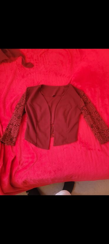 - Bordo bolero/sako: kratki kroj do struka, otvoren front bez kopčanja, elegantno modelirani šavovi, dugi čipkani rukavi sa cvetnim dezenom koji se slaže sa haljinom.