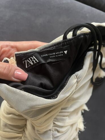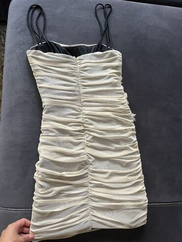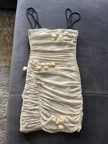 - Dizajn: uska silueta, mini dužina, naglašeno nabrana struktura oko cele haljine; dekorativne rese/čvorovi raspoređeni napred i pri dnu