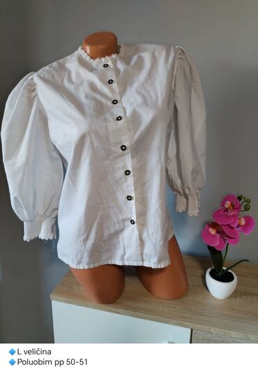 Ženska bela košulja sa puf rukavima - Veličina: L - Poluobim grudi (pp): 50–51 cm - Model: ravnog kroja, kopčanje napred dugmadima u kontrastnoj boji - Rukavi: dugi, naglašeno puf sa nabranim rame...