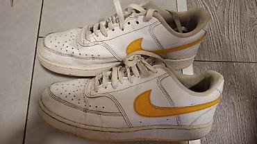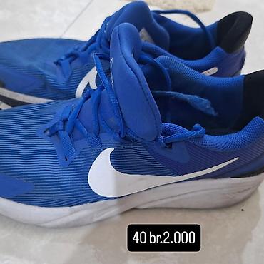 - Nike patike, broj 40 – cena 2.000 RSD. Plave sa belim Swoosh logoom, mrežasta konstrukcija za ventilaciju, mekano ojačan jezik, pertlanje i amortizovan srednji đon pogodan za svakodnevno nošenje i lagane treninge.