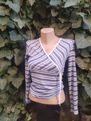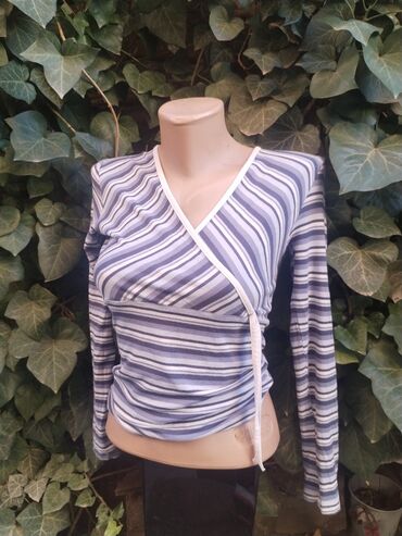 Ženska majica dugih rukava, svetloplave boje. - Kroj: pripijena silueta, V-izrez, ravno leži na leđima - Materijal: elastična, glatka tkanina prijatna na dodir - Rukavi: dugi - Veličina: S - Dužin...