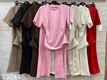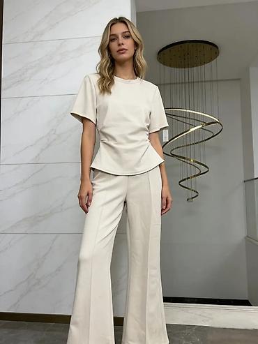 - Kroj: kratke rukave, okrugao izrez; strukirani detalj sa blagim peplum efektom koji naglašava liniju struka. Pantalone sa visokim strukom, ravne i blago zvonaste nogavice sa efektnim prednjim šavom.