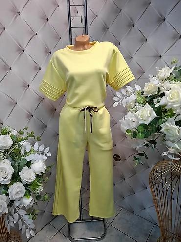 - Kroj: opušten, ravne nogavice sa bočnim rasporima; majica kratkih rukava sa spuštenim ramenima
