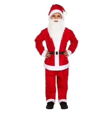 - Komplet Deda Mraz: crveno odelo sa belim obrubima, jakna na kopčanje, pantalone, crni dekorativni kaiš, kapa sa belim pufnom, bela brada i brkovi.