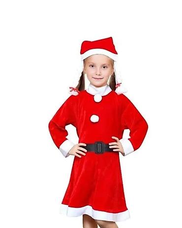 - Komplet Snežna pomoćnica: crvena haljinica do kolena sa belim obrubima, dugački rukavi, dekorativna dugmad, crni kaiš i kapa u kompletu.