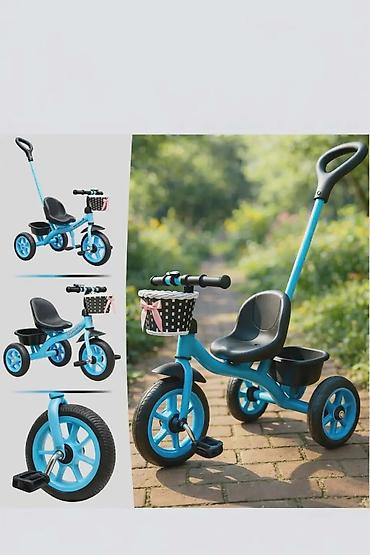 - Tricikl za decu sa mogućnošću vožnje pedalama ili guranje pomoću roditeljske ručke.