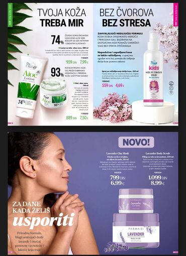 - NOVO – Lavender: maska za lice od gline 110 ml sa uljem lavande za mat efekat i umirenje; piling za telo 250 ml sa lavandom za nežno poliranje i glatku kožu.