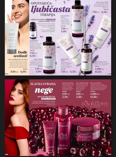 - Royal Cherry kolekcija: krema za ruke 30 ml, gel za tuširanje 225 ml i puter za telo 250 ml – inspirisano svežinom trešnje, baršunasta tekstura, intenzivna aroma i dubinska nega.