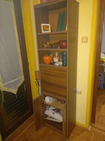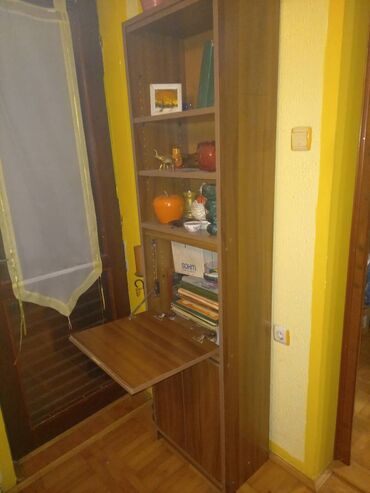 Praktično rešenje za čuvanje knjiga, posuđa, dokumenata ili sitnica, uz opciju preklopne mini radne površine. Dimenzije približno: širina uskog elementa (50cm), visina plafonska (194cm); dubina standardna za police (31cma).