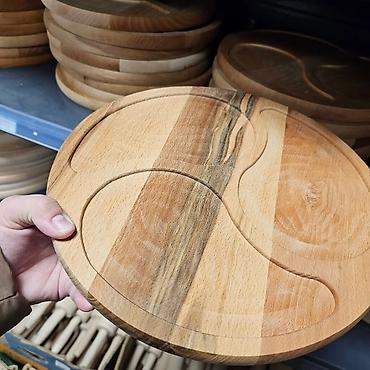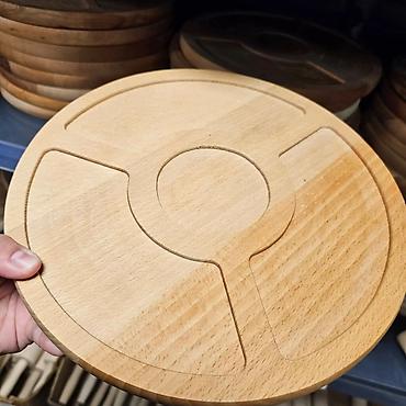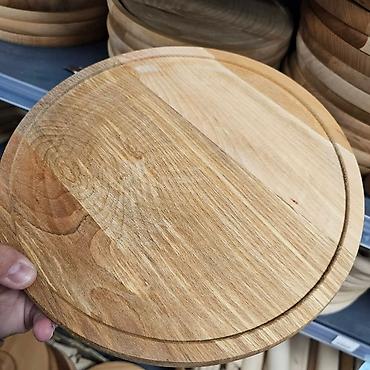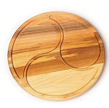 Okrugla drvena daska za serviranje i sečenje sa urezanim kanalima. -
