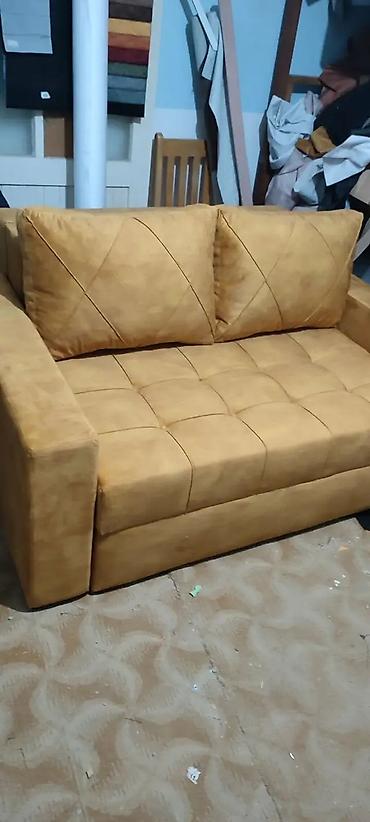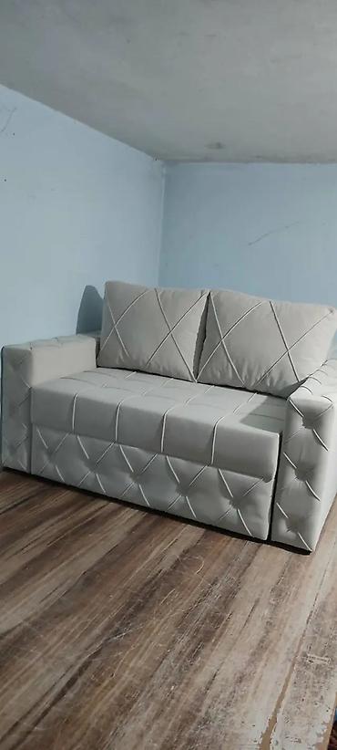 - Moderan tapacirani dvosjed sa dekorativnim prošivima i dve velike naslonske jastučnice