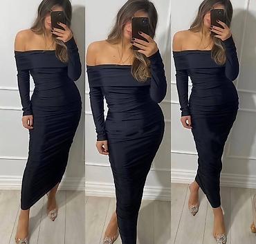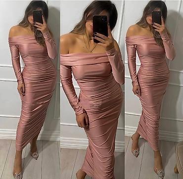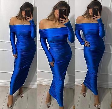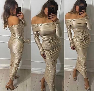 Elegantna večernja haljina – model sa spuštenim ramenima - Kroj: uska silueta koja prati liniju tela, duga dužina - Gornji deo: spuštena ramena (off-shoulder) sa glatkim, elastičnim pojasom oko de...
