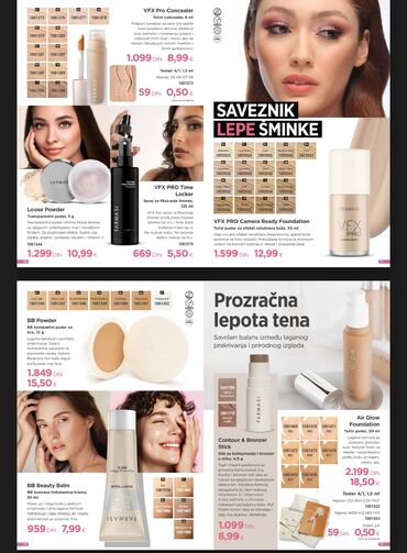- VFX PRO Camera Ready Foundation, 30 ml: tečni puder sa „retuš“ efektom, u više nijansi; ujednačava ten, smanjuje vidljivost pora i daje hidratantan efekat.