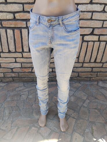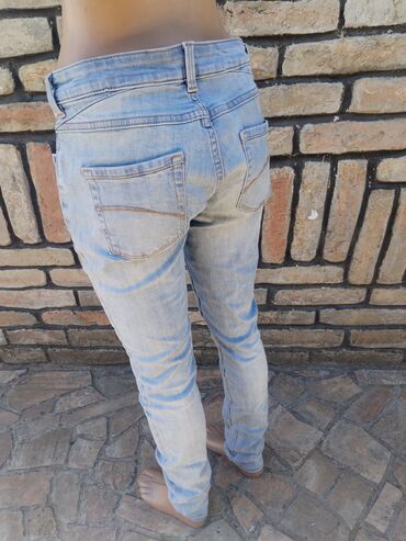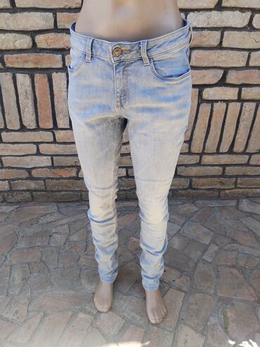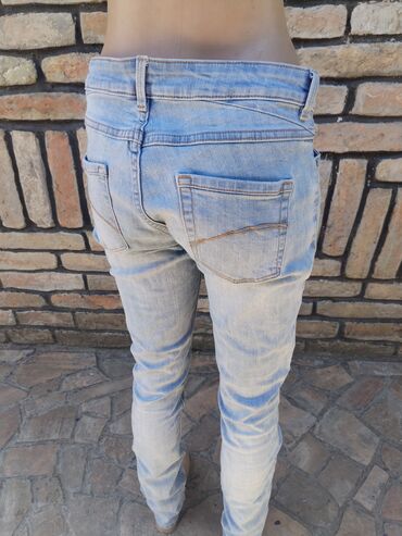 Ženske široke farmerke sa visokim strukom u svetloplavom, ispranom denimu. Model sa pet džepova i rupičastim/pocepanim efektom duž nogavica (prednji deo butina, kolena i potkolenice), plus sitni di...