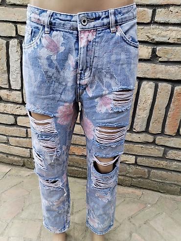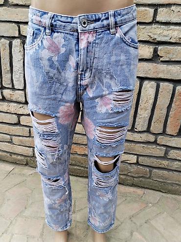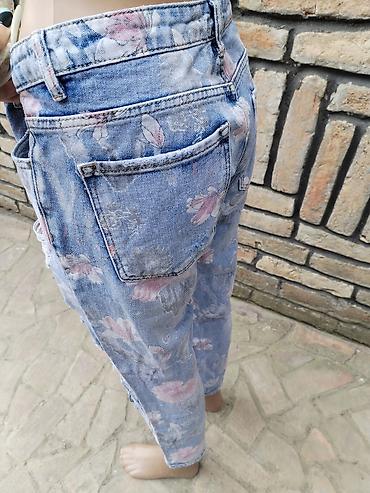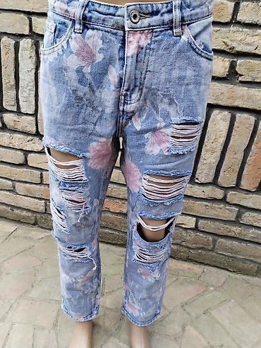 - Model: svetloplave teksas farmerke sa floralnim printom (ružičasti i beli tonovi)