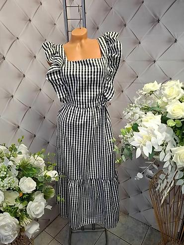 Haljina na kockice sa volanima - Kroj: midi dužina sa širokim volanom