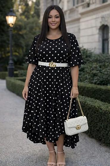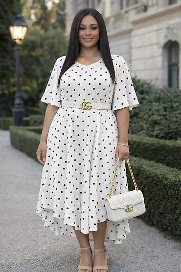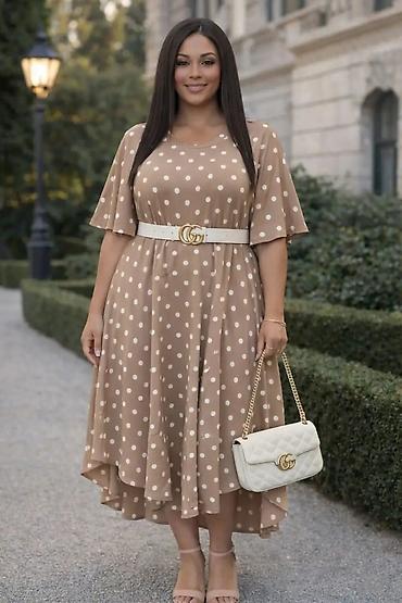 - Model: lepršava midi haljina sa blagim visokim/nižim porubom (duža pozadi), A-kroj koji naglašava struk i nežno pada preko kukova