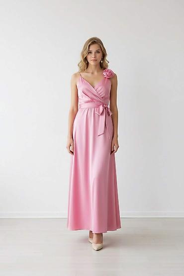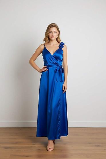 Elegantna satenska haljina u bež/šampanj nijansi. Asimetričan kroj sa drapiranim naborima naglašava struk i lepo prati liniju tela. Midi dužina, uska silueta, meko i glatko platno sa diskretnim sja...