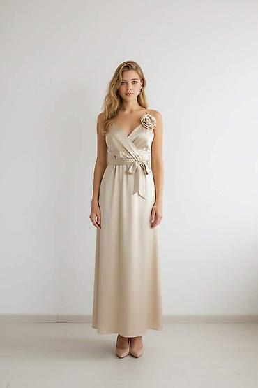 Elegantna satenska haljina u bež/šampanj nijansi. Asimetričan kroj sa