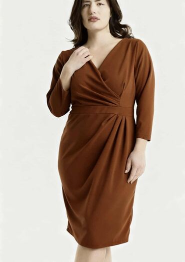 Žensko haljina/tunika u zlatno-braon boji sa sjajem. - Kroj: ravna silueta, dužina iznad kolena; 3/4 rukavi. - Izrez: širok okrugli izrez. - Materijal: rebrasti pleteni materijal sa diskretnim šlj...2 100 RSD